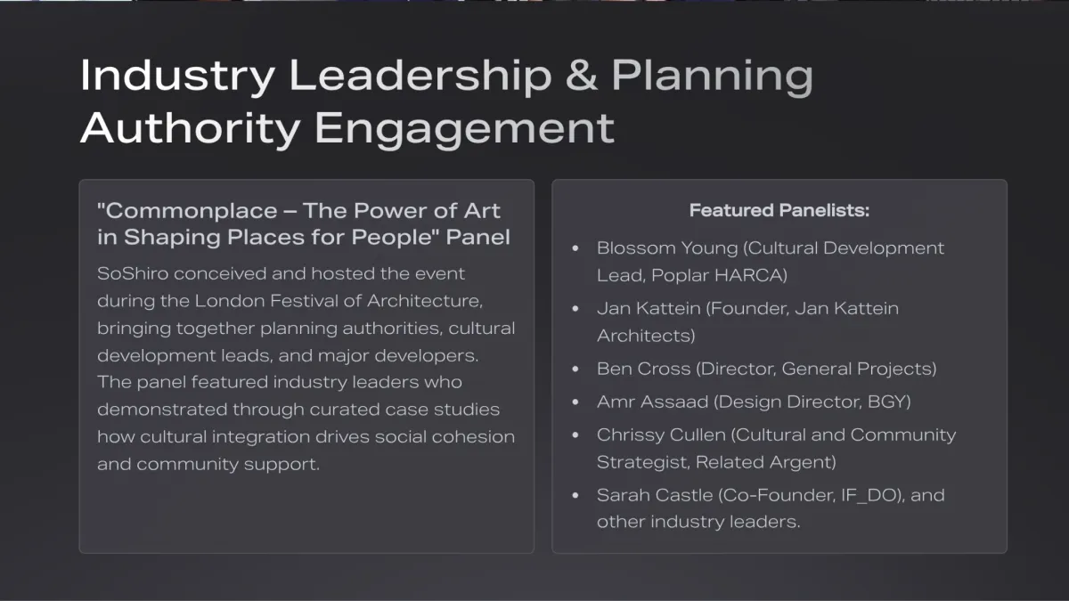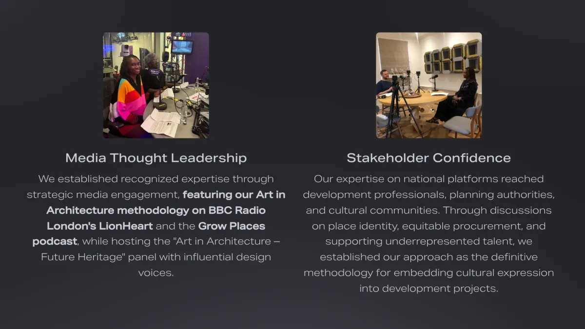 We integrate with RIBA Plan of Work and global frameworks, embedding cultural strategy early during strategic definition and concept design stages.